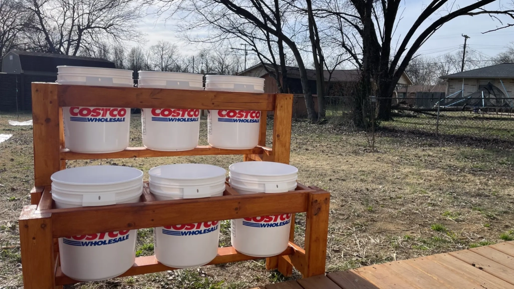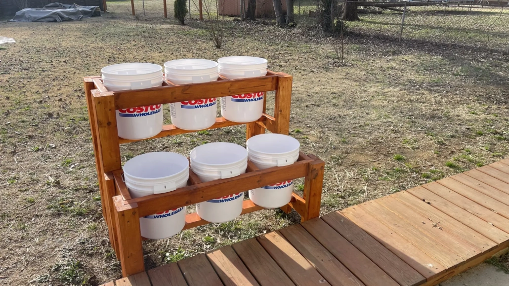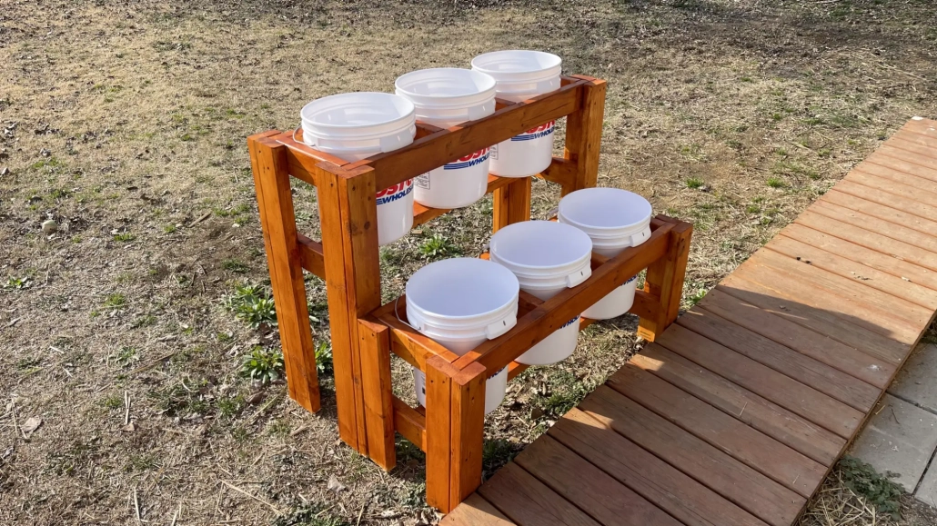 This is a straightforward 2×4 build that doesn’t require any special woodworking skills. All you need is a saw, a drill, and nine 8-foot boards from your local hardware store. The finished stand measures 45 inches wide and 36 inches tall, with two tiers that comfortably hold standard 5-gallon buckets.